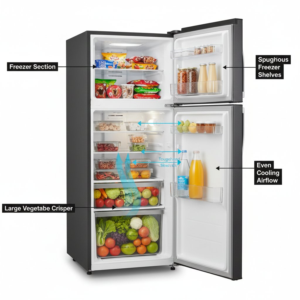 With its well-organized interior, toughened glass shelves, and spacious freezer compartment, it easily handles daily storage needs for small to medium families. The direct cool technology ensures fast and effective cooling while maintaining energy efficiency.
