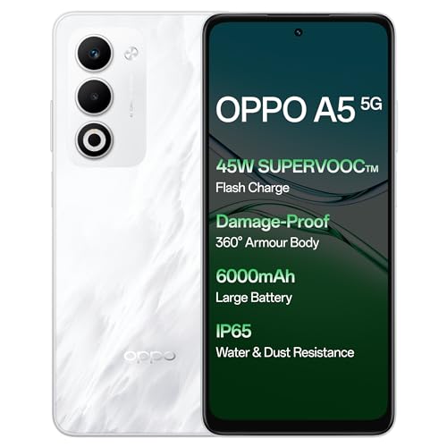 About this item PREMIUM DESIGN & ALL ROUND ARMOUR : Premium flagship-inspired exterior with a textured deco module design that conforms to the mainstream aesthetics to convey a premium image.Damage-Proof 360° Armour Protection Technology, Unyielding Defense for Your Device.Its high-strength alloy framework to ensure the safety of critical components. DISPLAY :16.94 cm (6.67″Inch) HD+ LCD 120Hz Ultra Bright Display to greatly improve the smoothness of screen touches.Splash Touch feature with Smooth touch control even when water droplets, mist, or oil stains exist on the screen surface. MEMORY STORAGE,SIM & PROCESSOR : 8GB RAM| 128GB ROM | Dual 5G Sim Slot |Latest Operating System ColorOS 15.0 |System Platform with MediaTek Dimensity 6300. CAMERA : AI Dual Ultra-Clear Camera 50MP Main Camera + 2MP Portrait camera |8MP Front Selfie Camera| AI Portrait Retouching |AI Clarity Enhancer|AI Reflection Remover|AI Studio|With the Dual-View Video on, the front and rear cameras can record videos at the same time, which is a new interesting form of video shooting. FAST CHARGING & BATTERY :45W SuperVOOC charging enable fast and efficient charging .OPPO A5 has 6000mAh large battery for longer run.Battery health maintains at > 80% after 1700 charge cycles , ensuring 5-year durability.