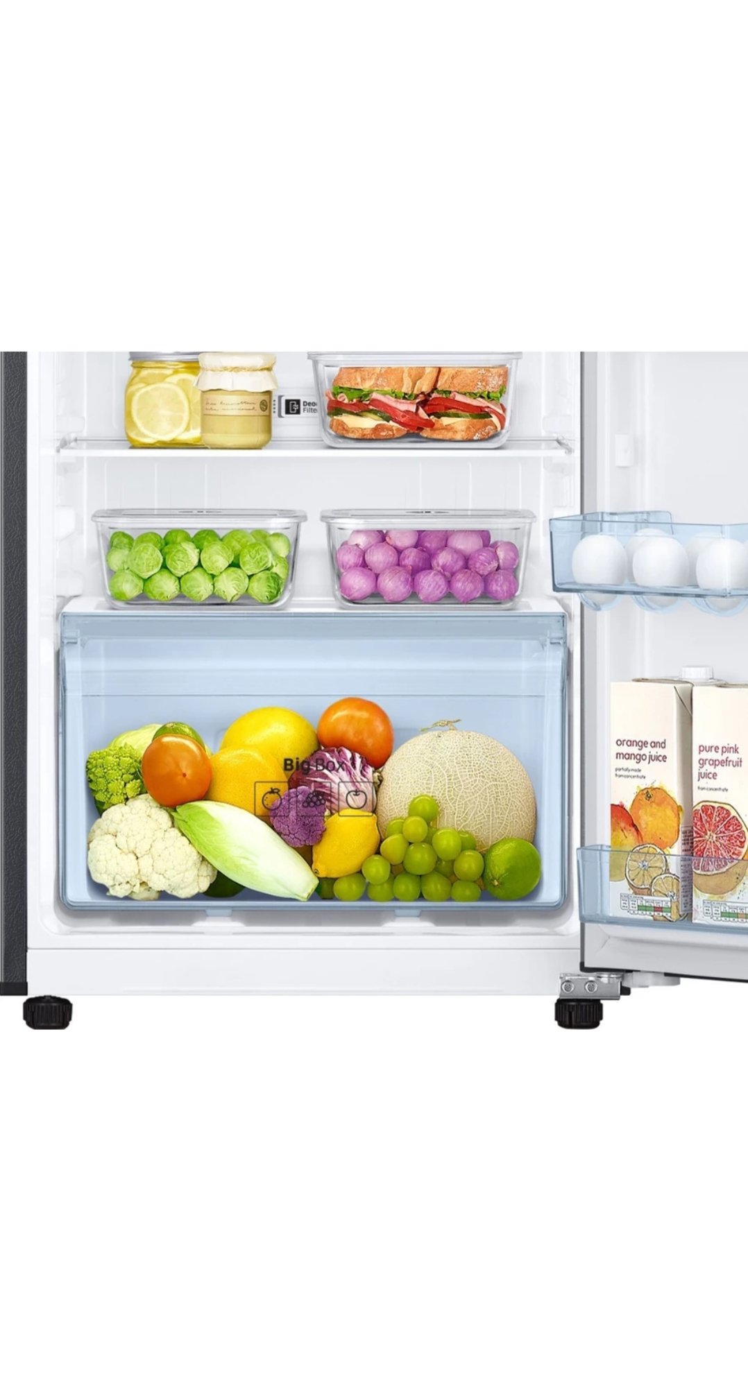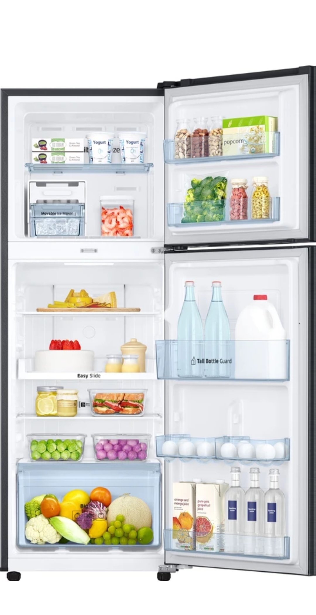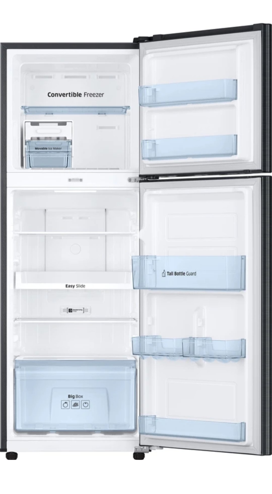 With advanced cooling performance, this refrigerator ensures uniform temperature distribution to keep your food fresh for longer. The spacious freezer section is perfect for frozen foods, while the toughened glass shelves provide strong support for heavy utensils and containers.