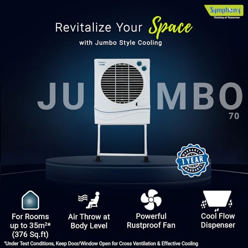 Warranty: The Symphony Jumbo 70 air cooler is protected by a 1-year warranty from the date of purchase, covering only manufacturing defects. |