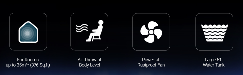 Coverage Area: The portable air cooler is appropriate for rooms up to an area of 35 square meters under optimal conditions. |