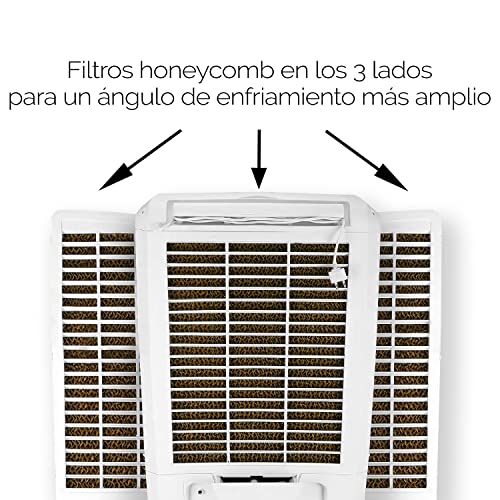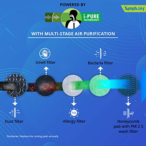 About this item 3-side honeycomb cooling pads provide enhanced cooling Dura pump technology ensures for long life of the pump Works on a powerful blower with 7 speed option Coverage area capacity for rooms up to 127 m3 I-pure technology provides multistage air purification that comprises of 5 stage filters against dust, smell, allergy, bacteria & wash