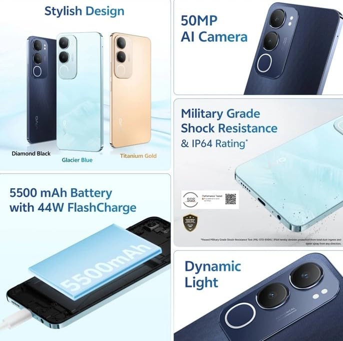 The vivo Y29 5G comes with 50 MP + 0.08 MP Rear Camera | 8MP Selfie Camera with Dimensity 6300 Processor , 4GB RAM, 128GB ROM, 44W fast charging, 16.96 cm (6.67-inch) + LCD Display, 5380 mAh (TYP) battery (C-Type) and much more.